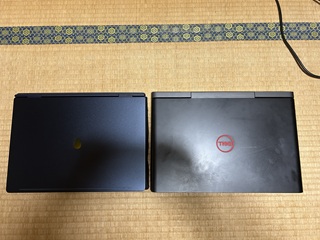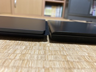 前のPCとの大きさ比較。奥行と厚さはほぼ変わらず。横幅が5センチぐらい狭くなっています。ディスプレイベゼルを狭くしているので、ディスプレイの大きさはほぼ変わらないですね。