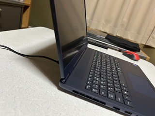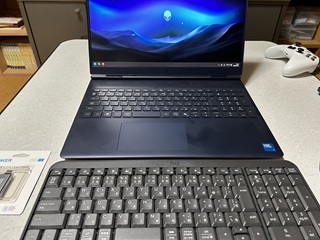 本体底面、パームレストともにプラスチック製なので見た目は安っぽいです。キーボードバックライトはありますけど、色は白だけです。エイリアンの目が光ったりもしないので、普通のPCとそう変わらない、落ち着いた見た目になりました(^^;